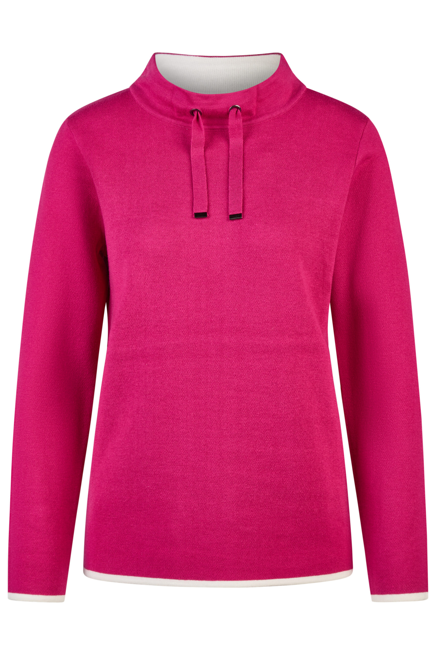 Ten amarantowy sweter Barbara Lebek z białą lamówką to idealny wybór dla kobiet ceniących komfort, ponadczasowy styl i modowe akcenty.