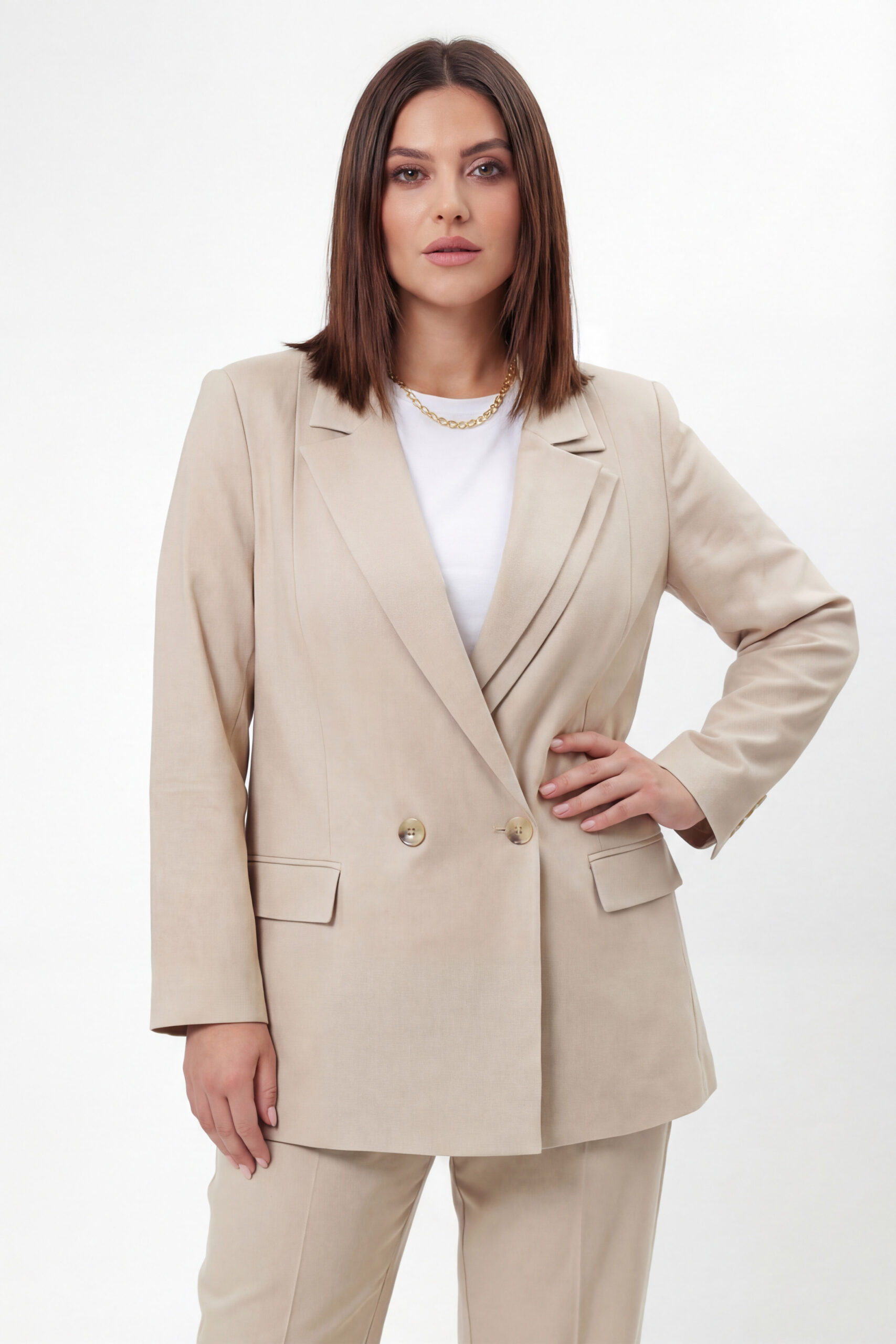 Elegancka marynarka damska marki JMP to stylowa propozycja na sezon wiosenny dla kobiet, które cenią klasykę w nowoczesnym wydaniu. Model w ponadczasowym beżowym kolorze prezentuje się niezwykle subtelnie i elegancko, dzięki czemu doskonale sprawdzi się w wielu stylizacjach – zarówno codziennych, jak i bardziej formalnych. Klasyczny krój z eleganckim kołnierzem i kopertowym zapięciem nadaje całości szyku oraz podkreśla kobiecą sylwetkę.