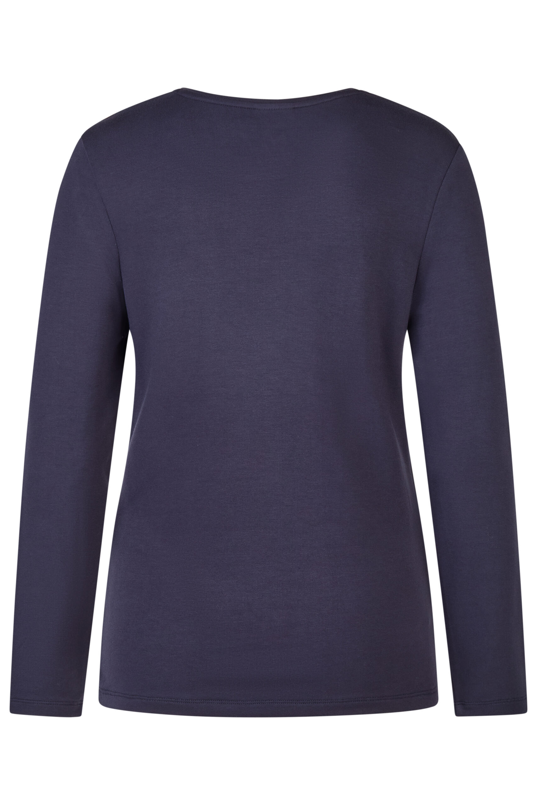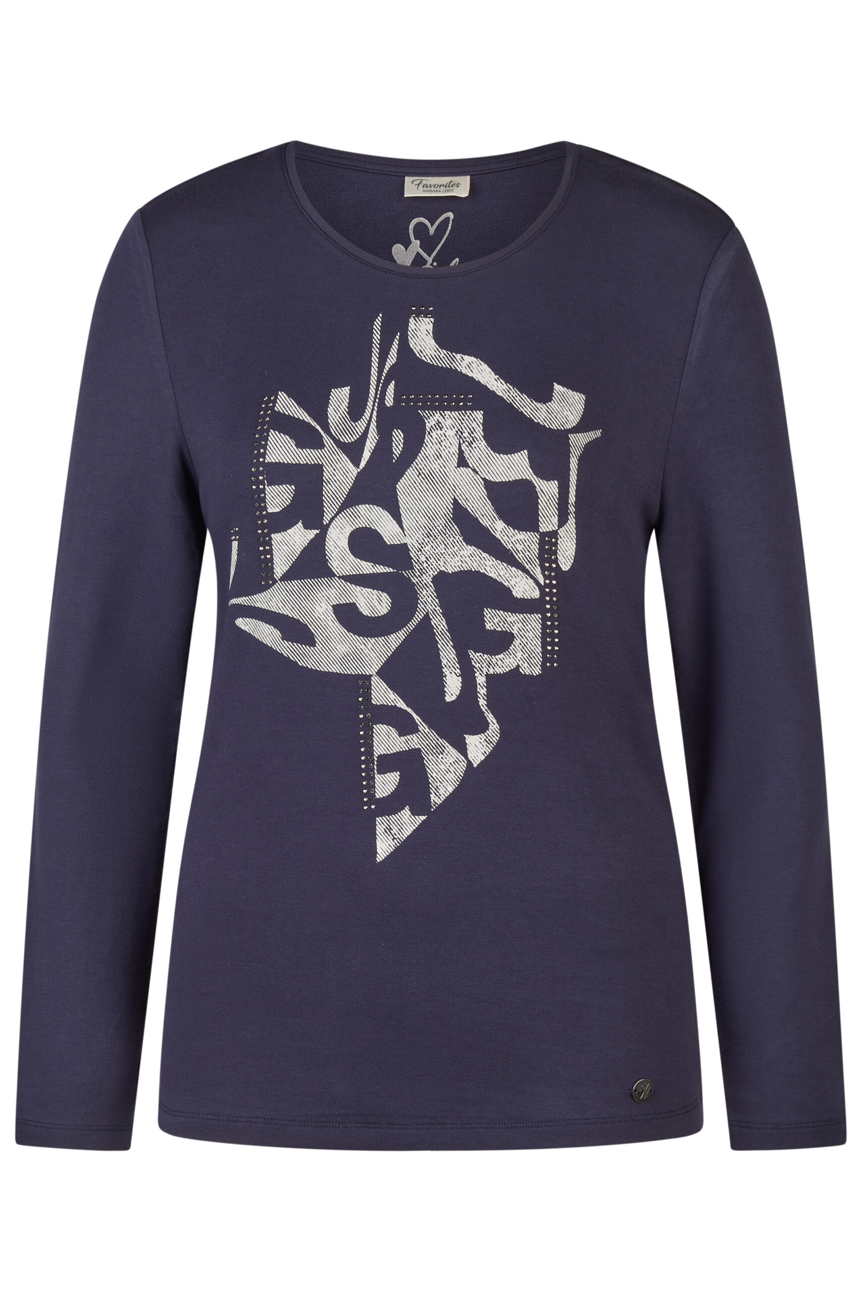 Model w kolorze granatowym, na przodzie zdobiony nowoczesnym nadrukiem literowym w granatowym kolorze z subtelnym akcentem błyszczących dżetów. Dzięki prostemu krojowi bluzka doskonale układa się na sylwetce, a jednocześnie nadaje stylizacji modnego charakteru.