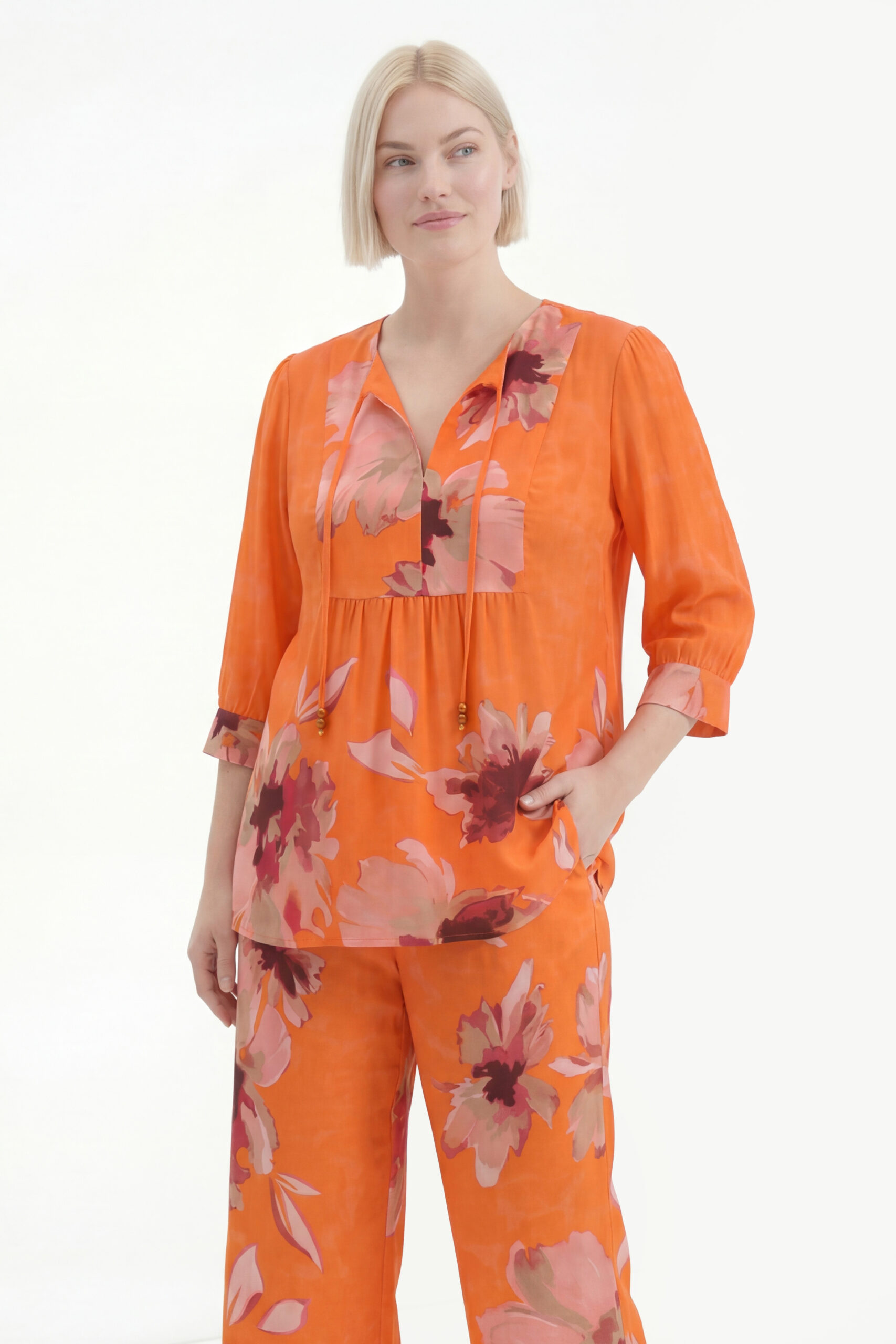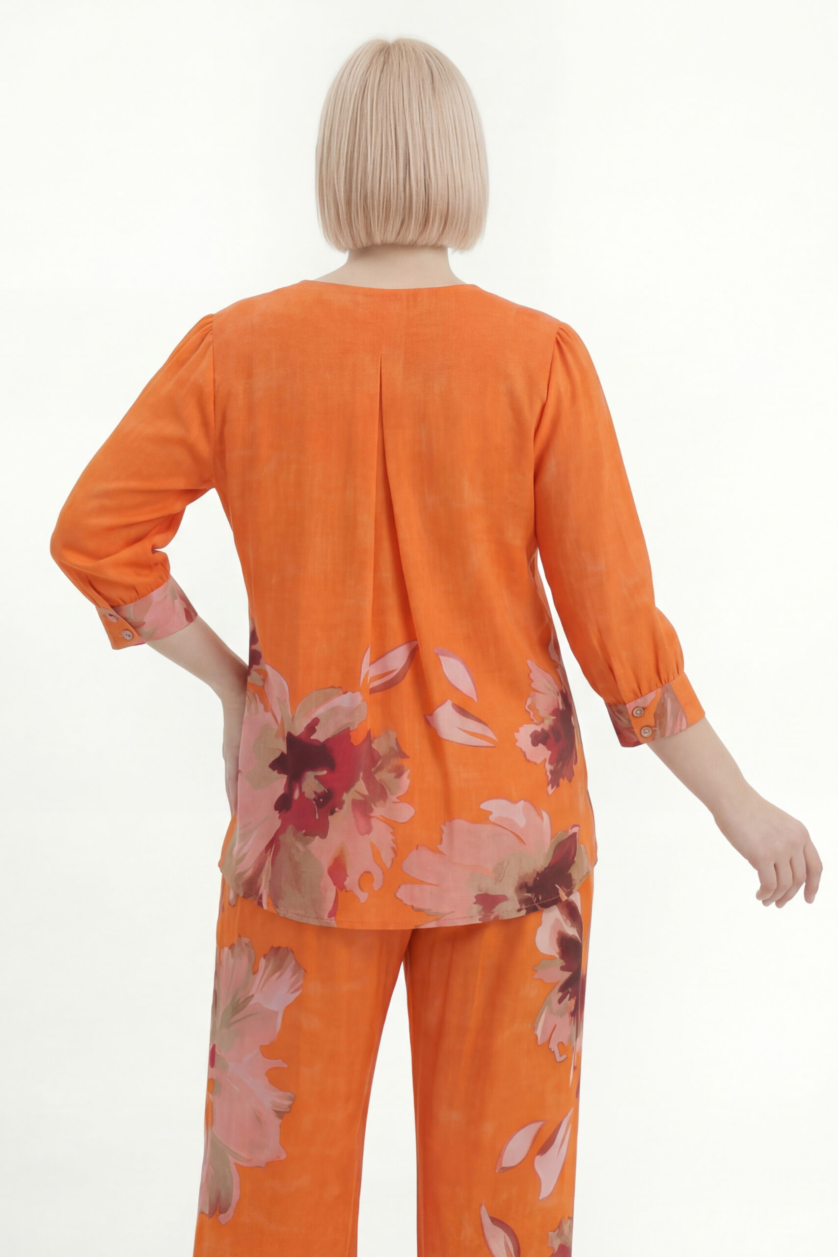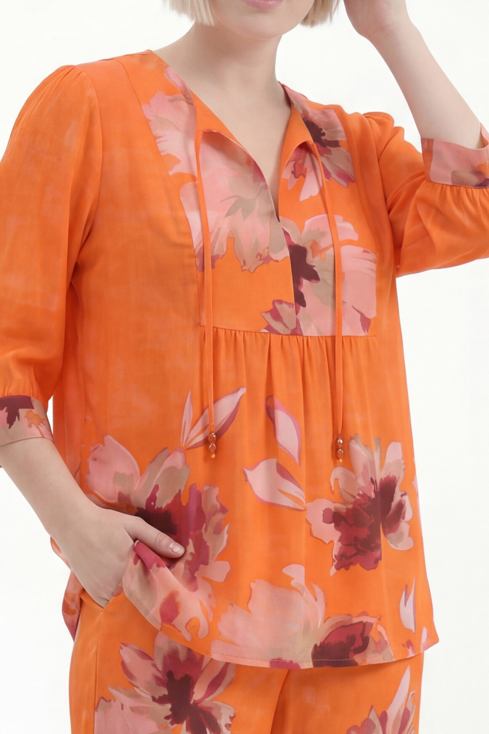 Wyrazista i kobieca bluzka marki JMP to doskonały wybór na wiosnę i lato. Model w energetycznym, pomarańczowym kolorze ozdobiony dużym, kwiatowym printem przyciąga uwagę i dodaje stylizacji świeżości oraz lekkości.