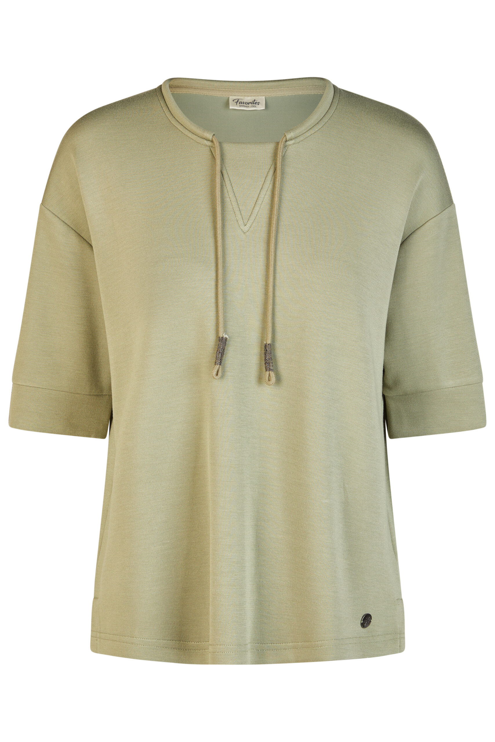 Stylowa bluzka marki Barbara Lebek w modnym odcieniu oliwkowej zieleni to idealna propozycja na wiosnę i lato. Luźniejszy fason zapewnia swobodę i komfort noszenia, a miękka, lejąca tkanina pięknie układa się na sylwetce. Dekolt z subtelnym rozcięciem i ozdobnymi troczkami nadaje całości nowoczesnego, sportowo-eleganckiego charakteru. Rękawy o długości do łokcia optycznie wysmuklają ramiona i sprawiają, że model świetnie sprawdzi się zarówno na co dzień, jak i do pracy.