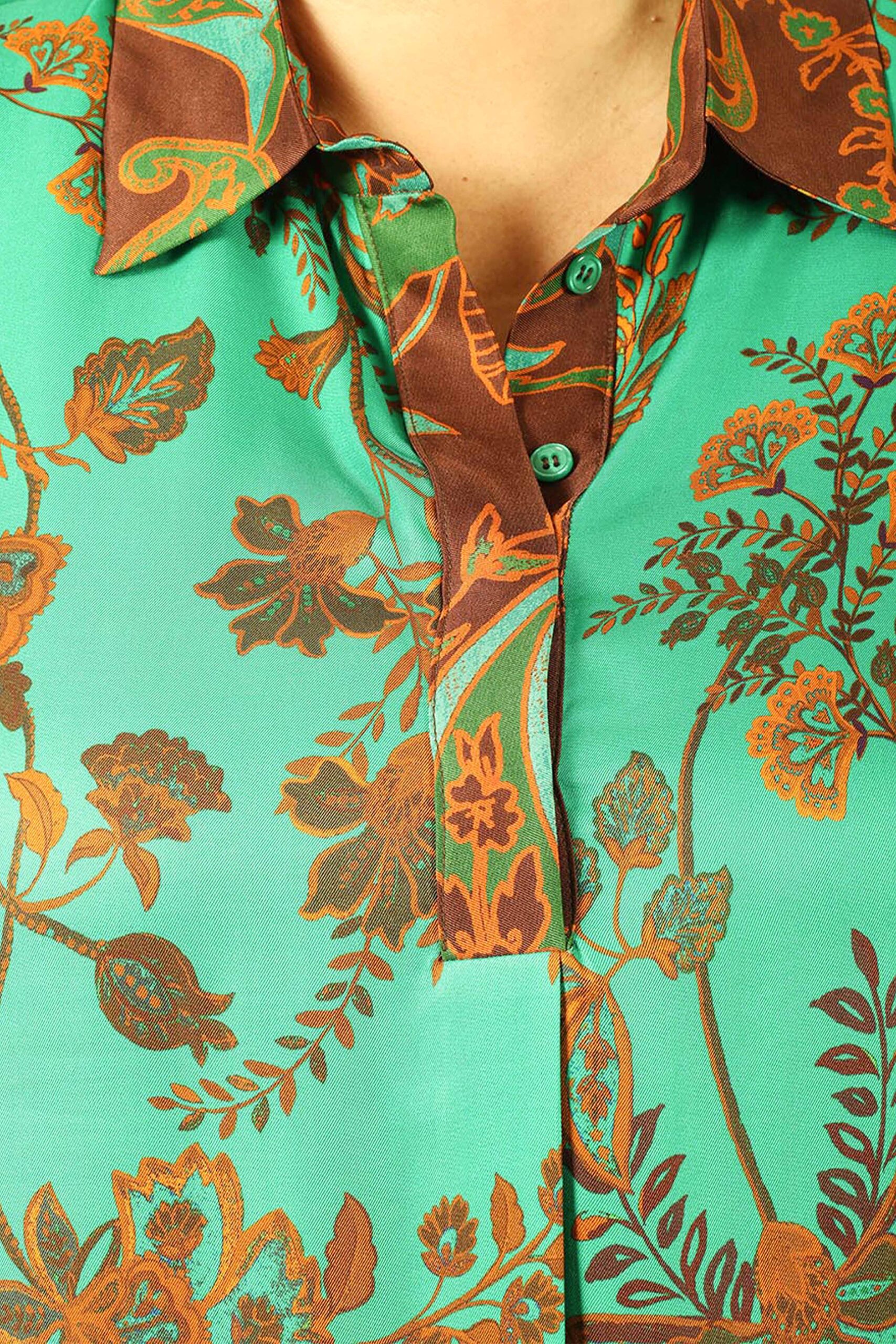Efektowna bluzka damska w rozmiarze plus size, która przyciąga uwagę turkusowo-brązową kolorystyką i bogatym, roślinnym wzorem w stylu boho. Uszyta z lekkiej, przewiewnej tkaniny, zapewnia komfort noszenia i swobodę ruchów. 100% wiskoza