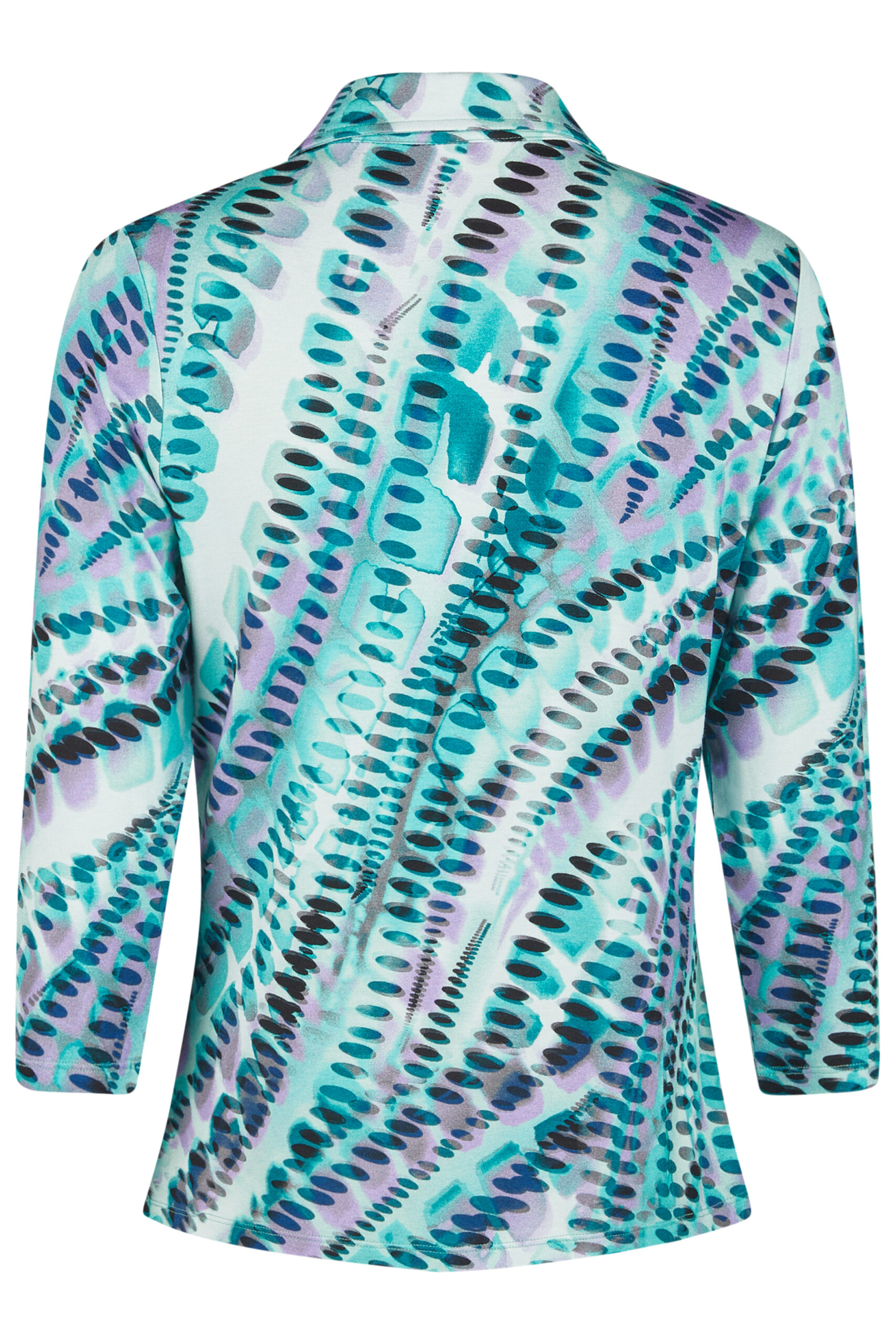 Zielono-fioletowe wzory sprawiają, że bluzka jest zarówno stonowana, jak i pełna energii. Kolorystyka jest wystarczająco uniwersalna, by pasować do różnych stylizacji, od casualowych po bardziej eleganckie.