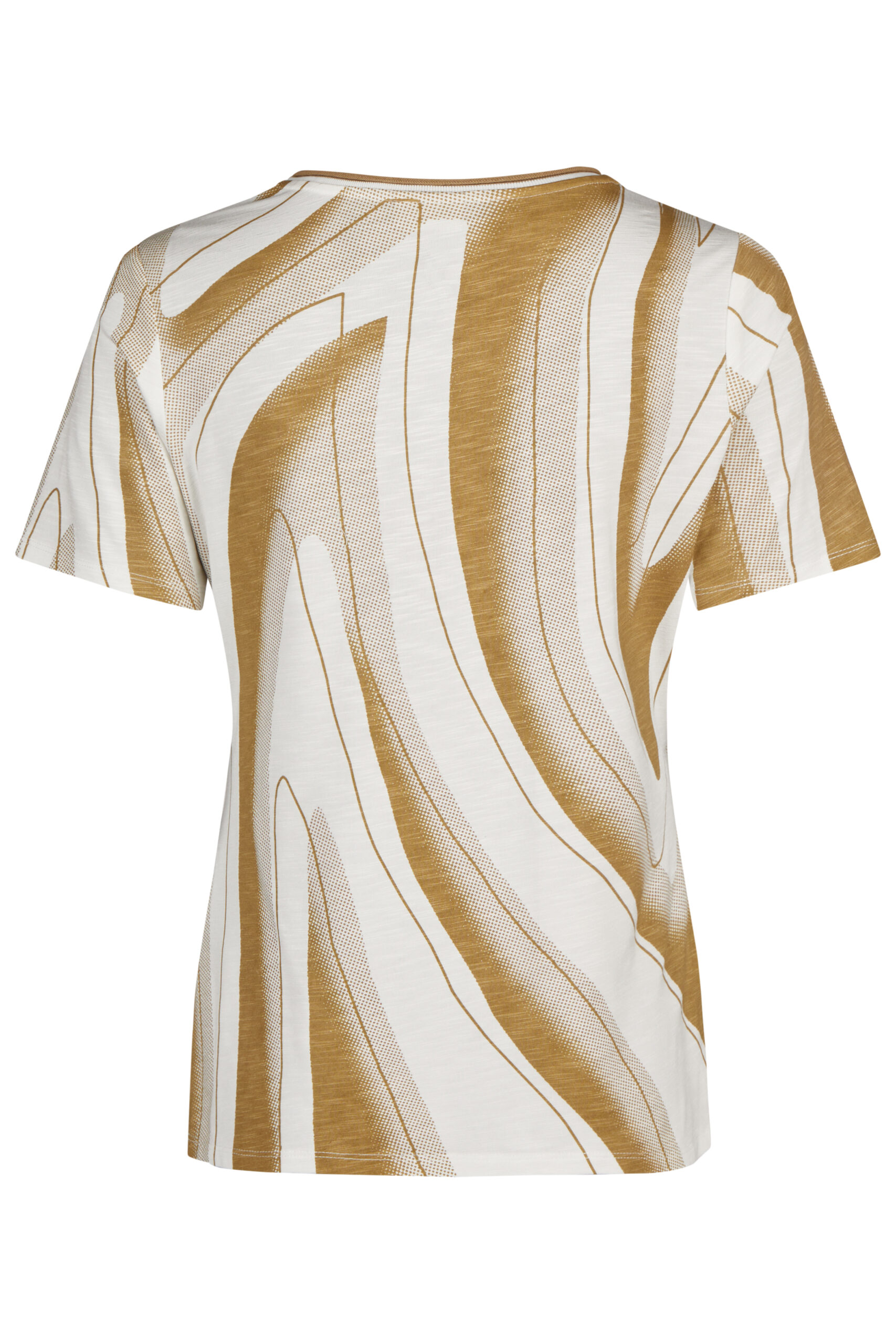 Materiał jest lekki, miękki i przyjemny dla skóry, dzięki czemu świetnie sprawdzi się również w cieplejsze dni. Klasyczny krój z krótkim rękawem został urozmaicony nowoczesnym wzorem w odcieniach bieli, brązu i żółci, który dodaje całości świeżości i energii. Dekolt w subtelnym, okrągłym wykończeniu nadaje całości kobiecego charakteru, a przewiewna tkanina wiskozowa pięknie układa się na sylwetce.