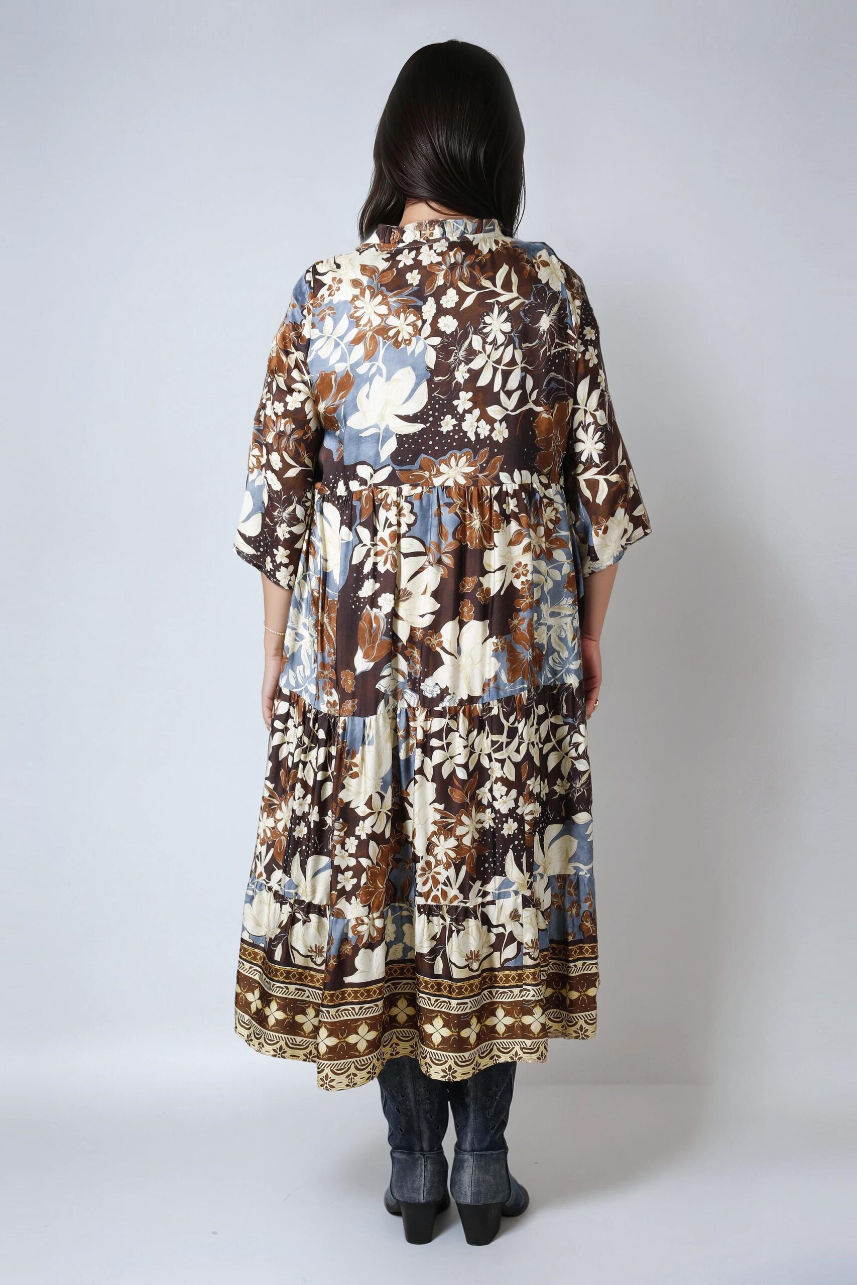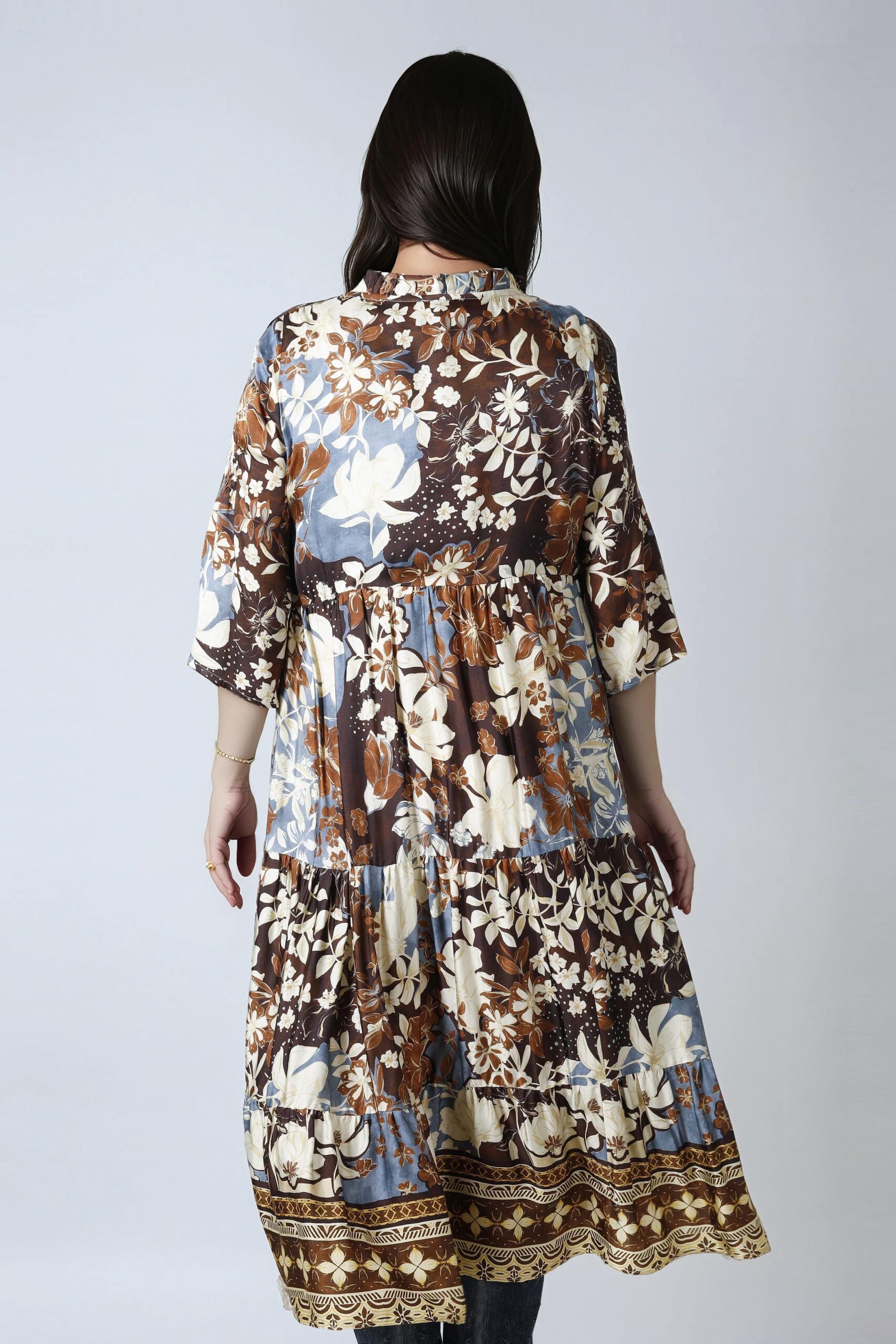 Wzór w brązowo-niebieskie kwiaty nadaje jej wyjątkowego charakteru i doskonale wpisuje się w jesienną kolorystykę. Dekolt w serek subtelnie podkreśla kobiecą linię szyi i wysmukla sylwetkę, a dłuższy krój nadaje sukience elegancji i sprawia, że sprawdzi się zarówno w codziennych, jak i bardziej formalnych stylizacjach.