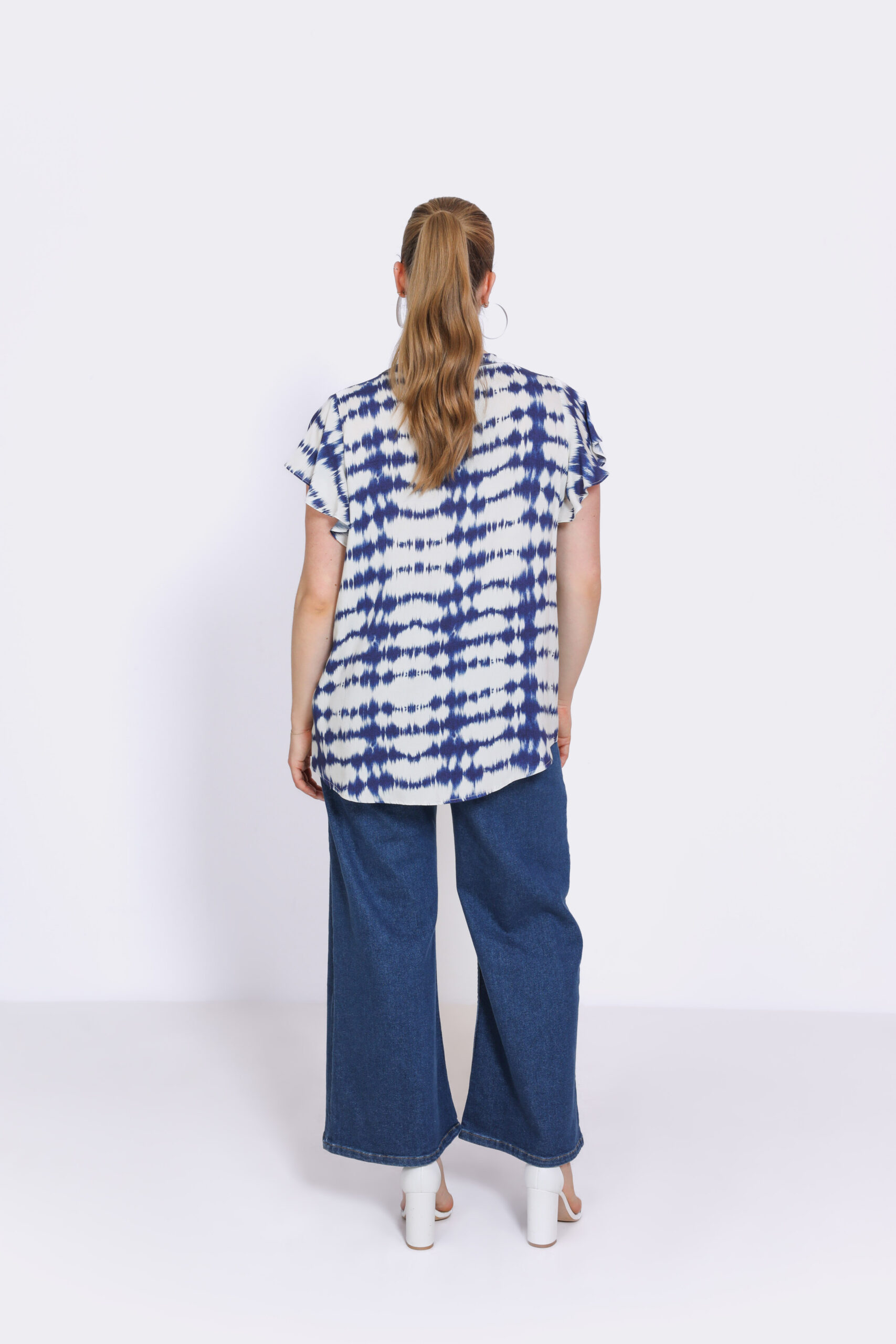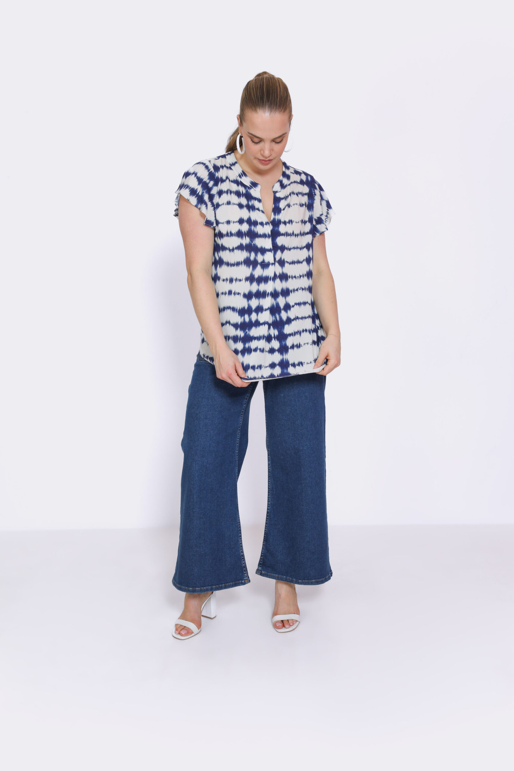 Lekka i stylowa bluzka damska w rozmiarze plus size, utrzymana w modnym wzorze tie-dye w odcieniach granatu i bieli. Uszyta z przewiewnej, delikatnej tkaniny, doskonale sprawdzi się w codziennych stylizacjach, zapewniając komfort i swobodę ruchów.