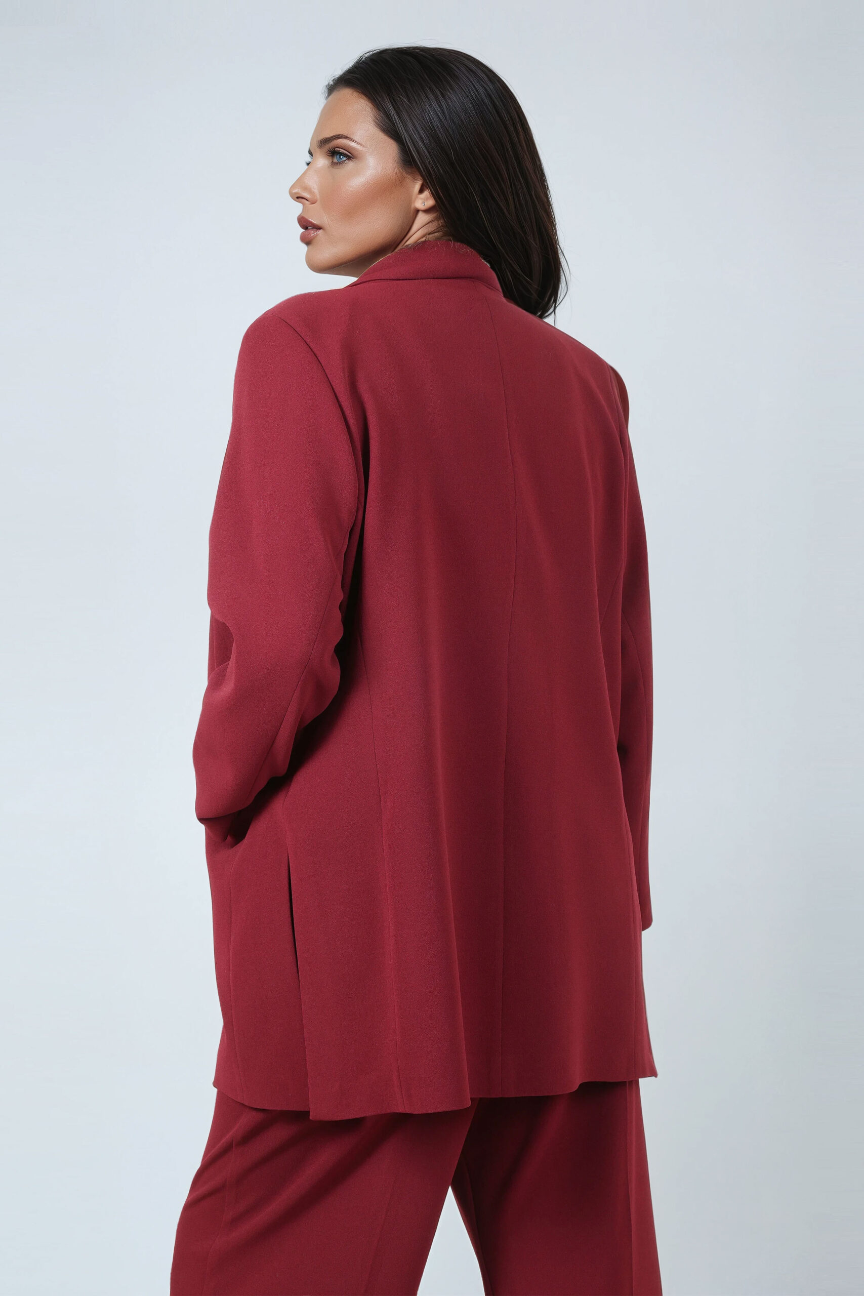 Marynarka ma klasyczny krój z eleganckim zapięciem na dwa guziki, co nadaje jej ponadczasowy charakter i sprawia, że doskonale prezentuje się zarówno w stylizacjach biznesowych, jak i podczas wyjątkowych okazji. Bordowy kolor dodaje energii, a jednocześnie podkreśla kobiecość, będąc świetną alternatywą dla czerni czy granatu.