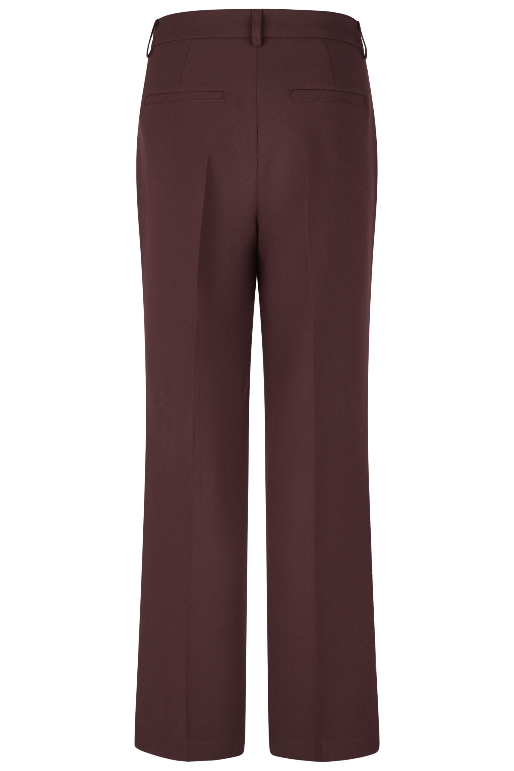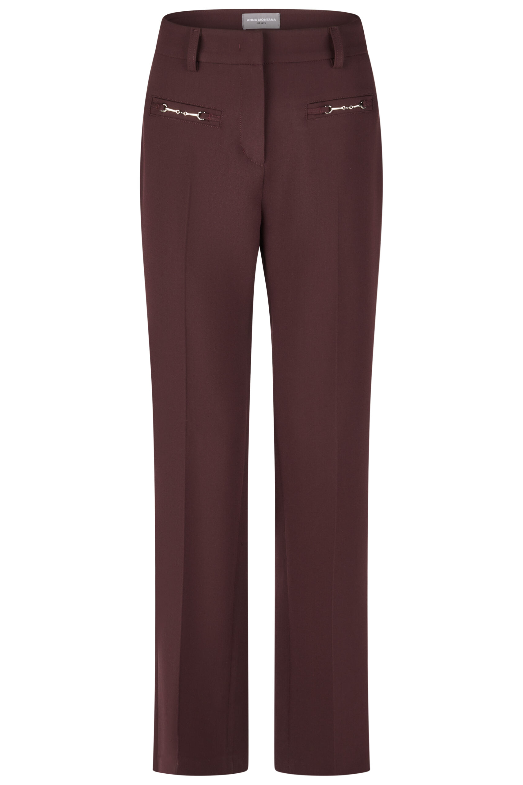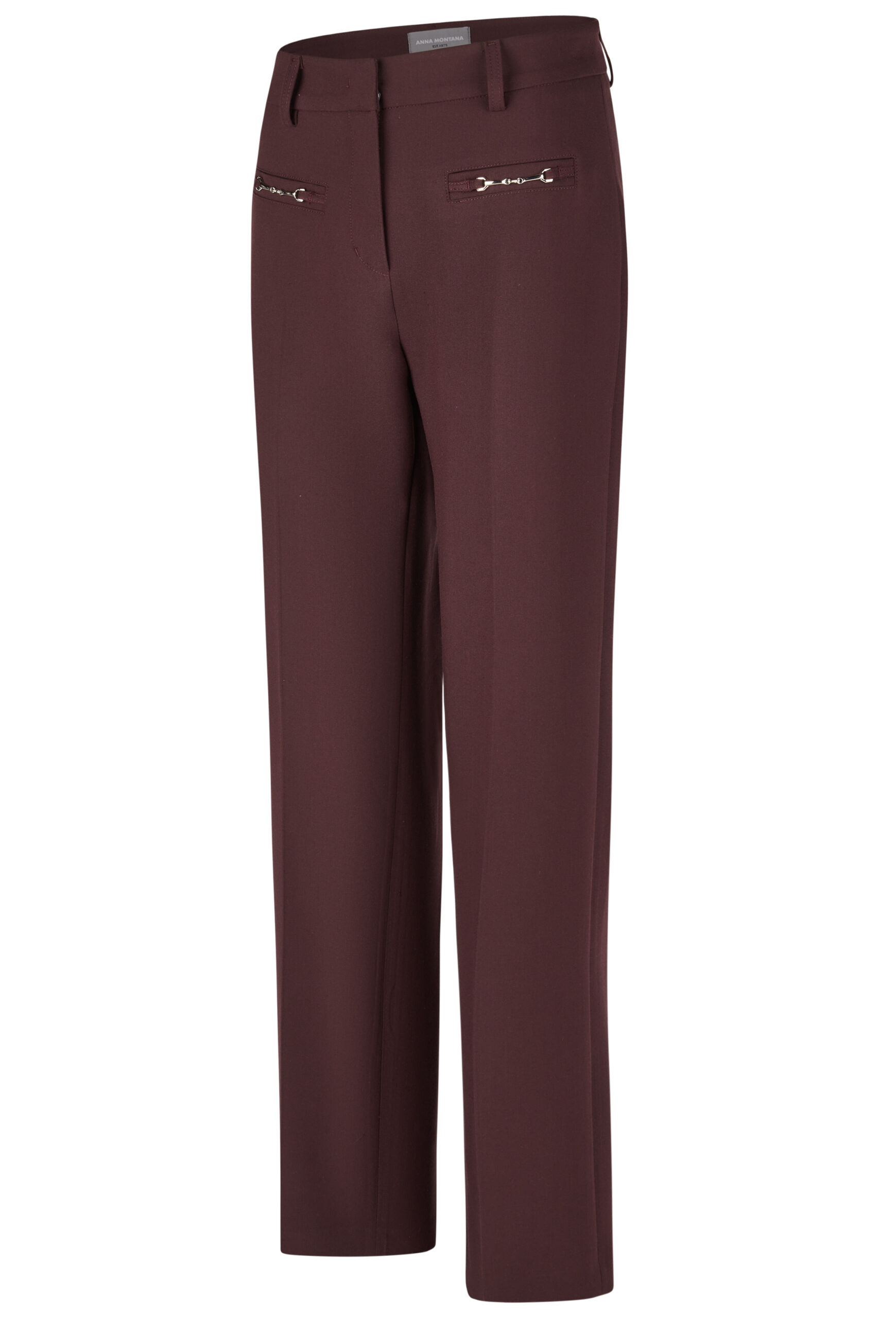 Model w kolorze głębokiego bordo posiada prosty fason z lekko zwężaną nogawką, który optycznie wysmukla nogi. W pasie wszyte są szlufki umożliwiające noszenie paska. Dodatkowym atutem są ozdobne kieszenie z suwakami i metalowymi detalami, które dodają całości nowoczesnego i eleganckiego charakteru.