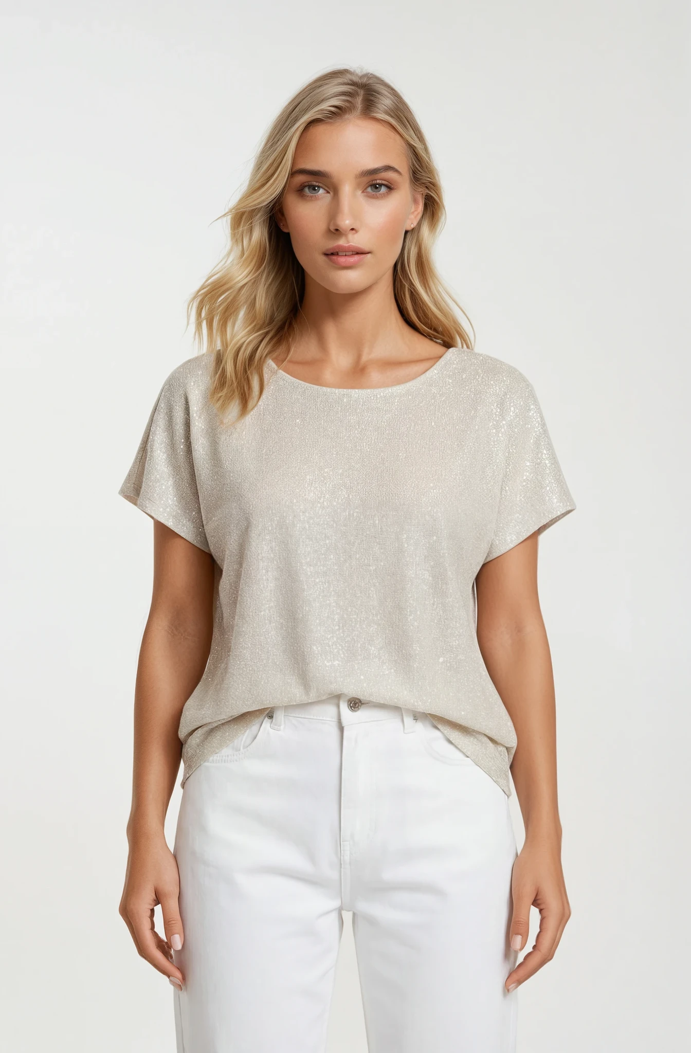 Bluzka posiada luźny, swobodny fason, który pięknie układa się na sylwetce i zapewnia wygodę noszenia. Krótkie, lekko opadające rękawy dodają lekkości, a klasyczny, półokrągły dekolt podkreśla minimalistyczny styl. Subtelnie wydłużony tył sprawia, że model dobrze prezentuje się zarówno noszony luźno, jak i częściowo wpuszczony w spodnie.