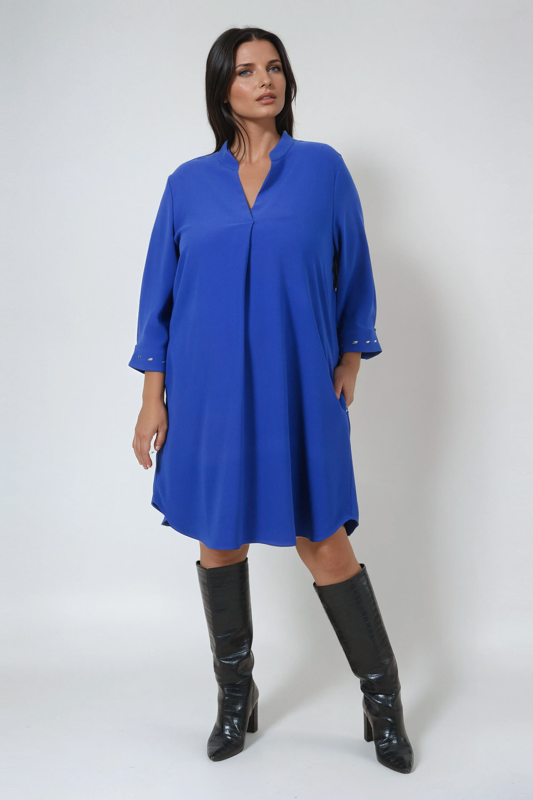 Stylowa i kobieca sukienka w rozmiarze plus size, idealna na wiele okazji. Wykonana z lekkiego, przyjemnego w dotyku materiału, który pięknie układa się na sylwetce i zapewnia wygodę noszenia. Sukienka z dwiema kieszeniami.