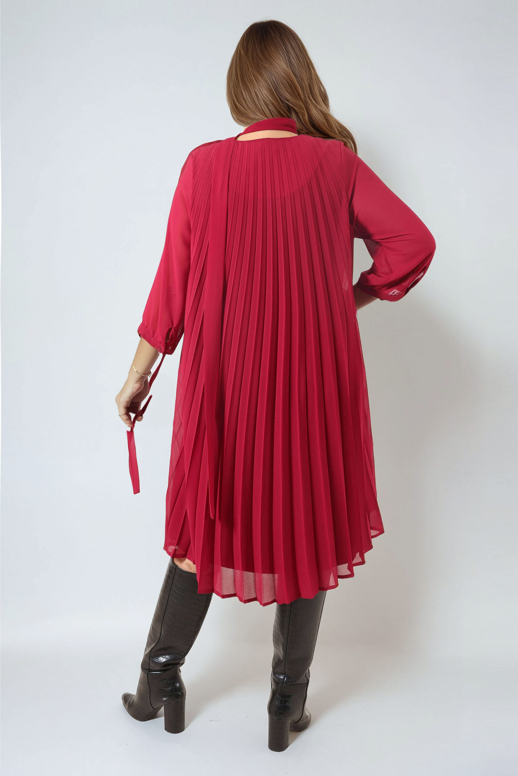 Elegancka sukienka plus size w klasycznym bordo. Wykonana z lekkiego, zwiewnego poliestru, pięknie układa się na sylwetce i zapewnia komfort noszenia. Delikatne plisowanie nadaje jej lekkości i nowoczesnego charakteru, a dekolt w serek subtelnie podkreśla dekolt.