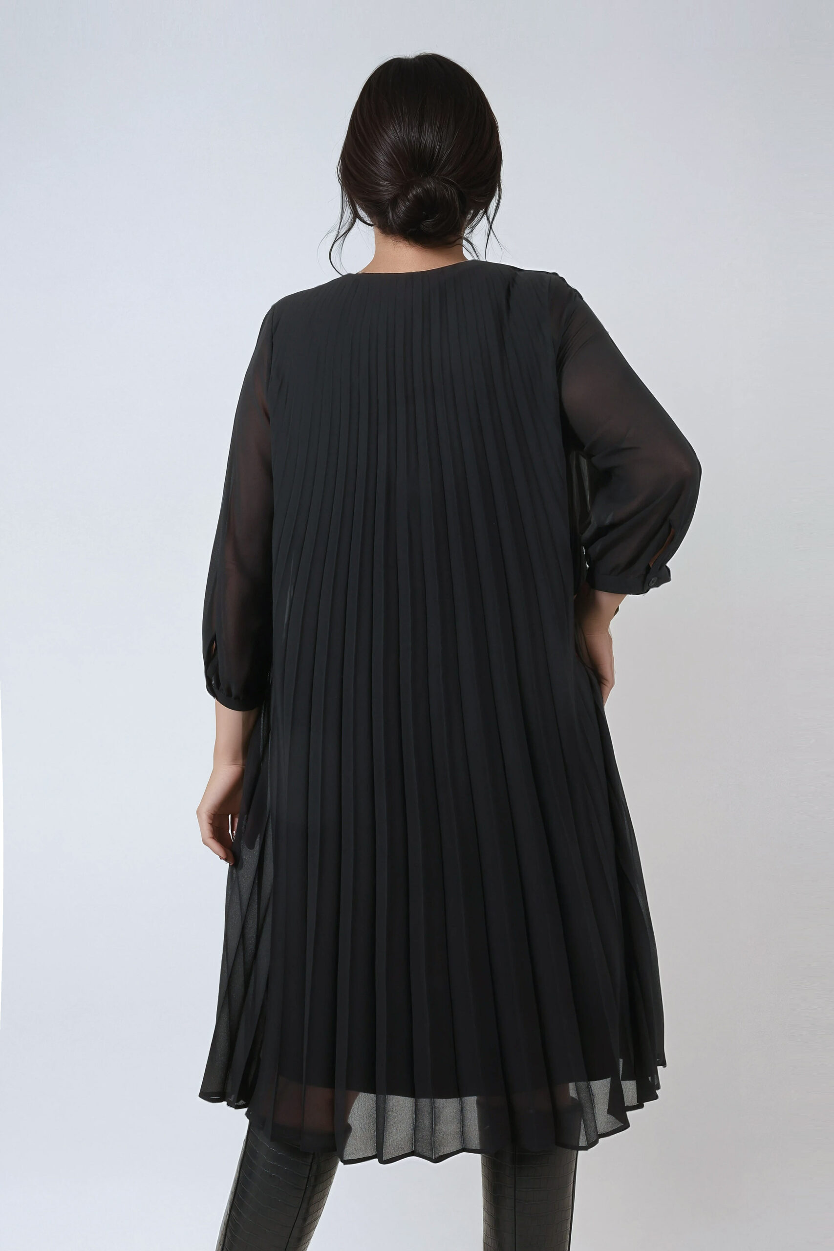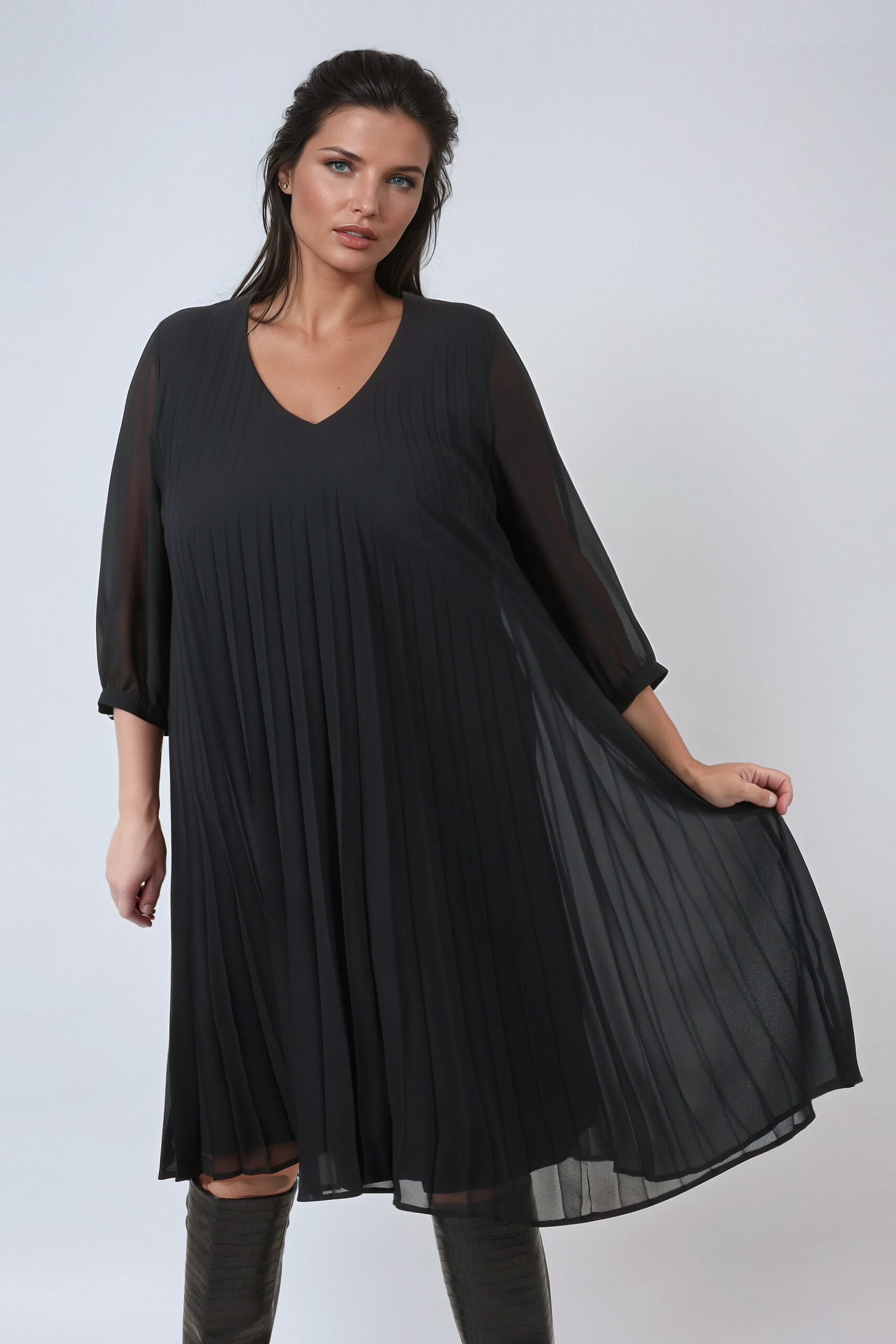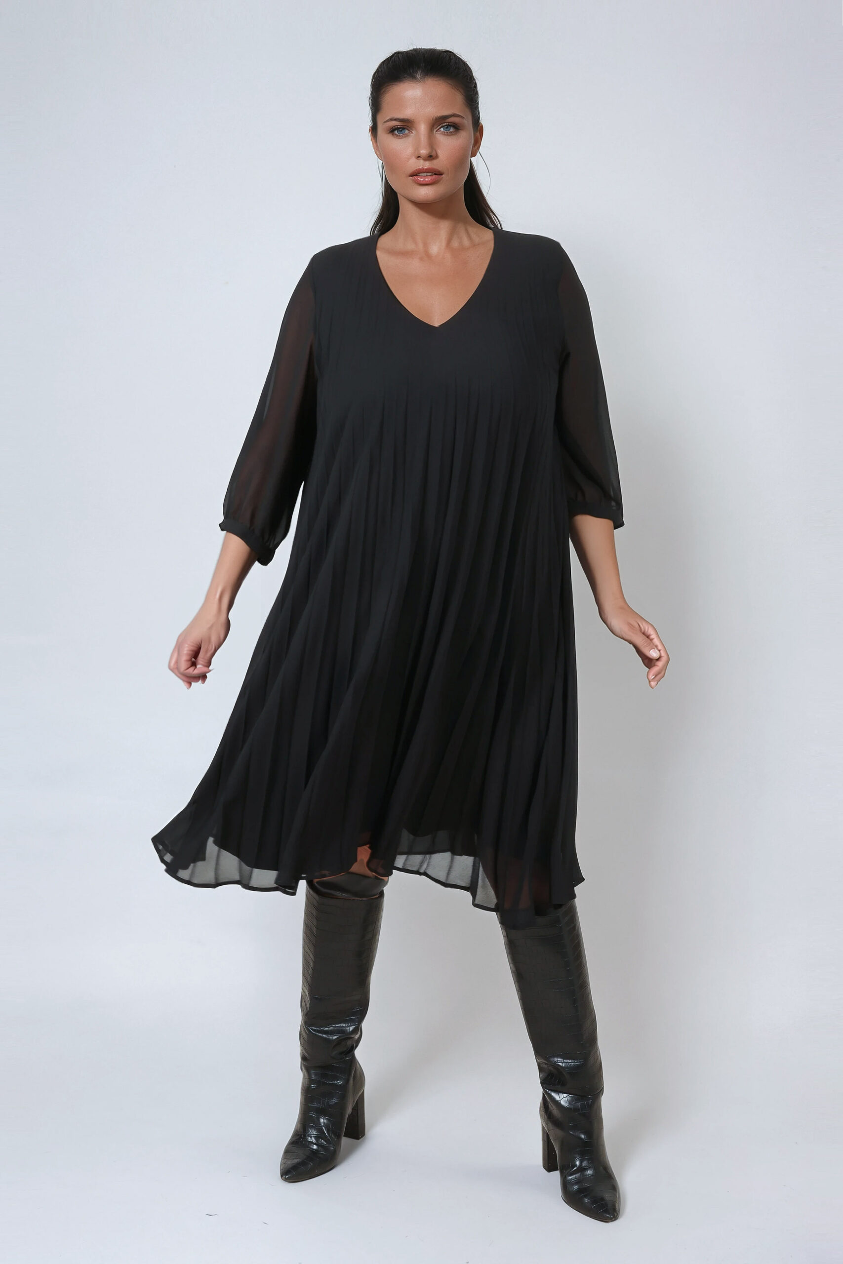 Elegancka sukienka plus size w klasycznej czerni. Wykonana z lekkiego, zwiewnego poliestru, pięknie układa się na sylwetce i zapewnia komfort noszenia. Delikatne plisowanie nadaje jej lekkości i nowoczesnego charakteru, a dekolt w serek subtelnie podkreśla dekolt.