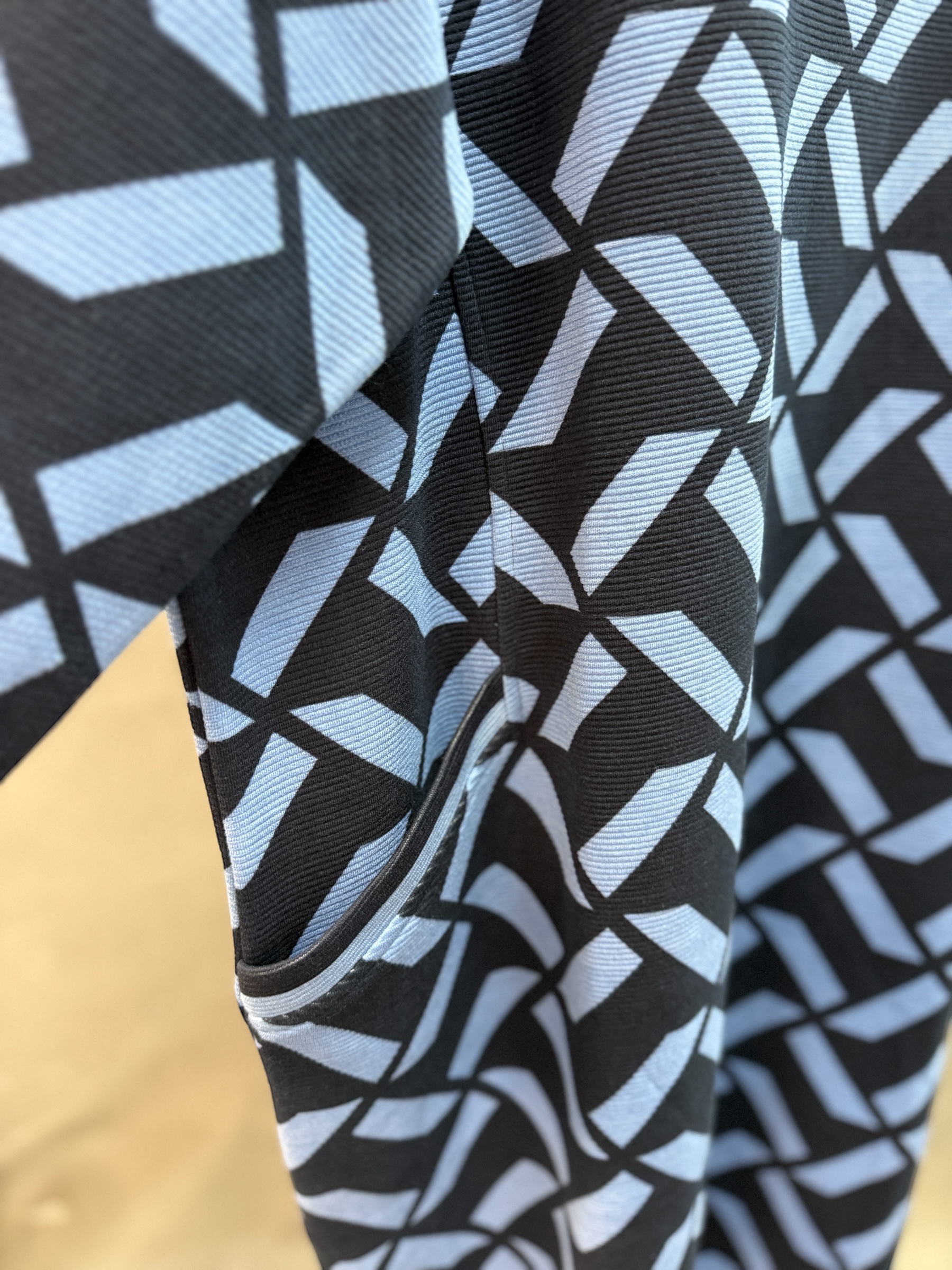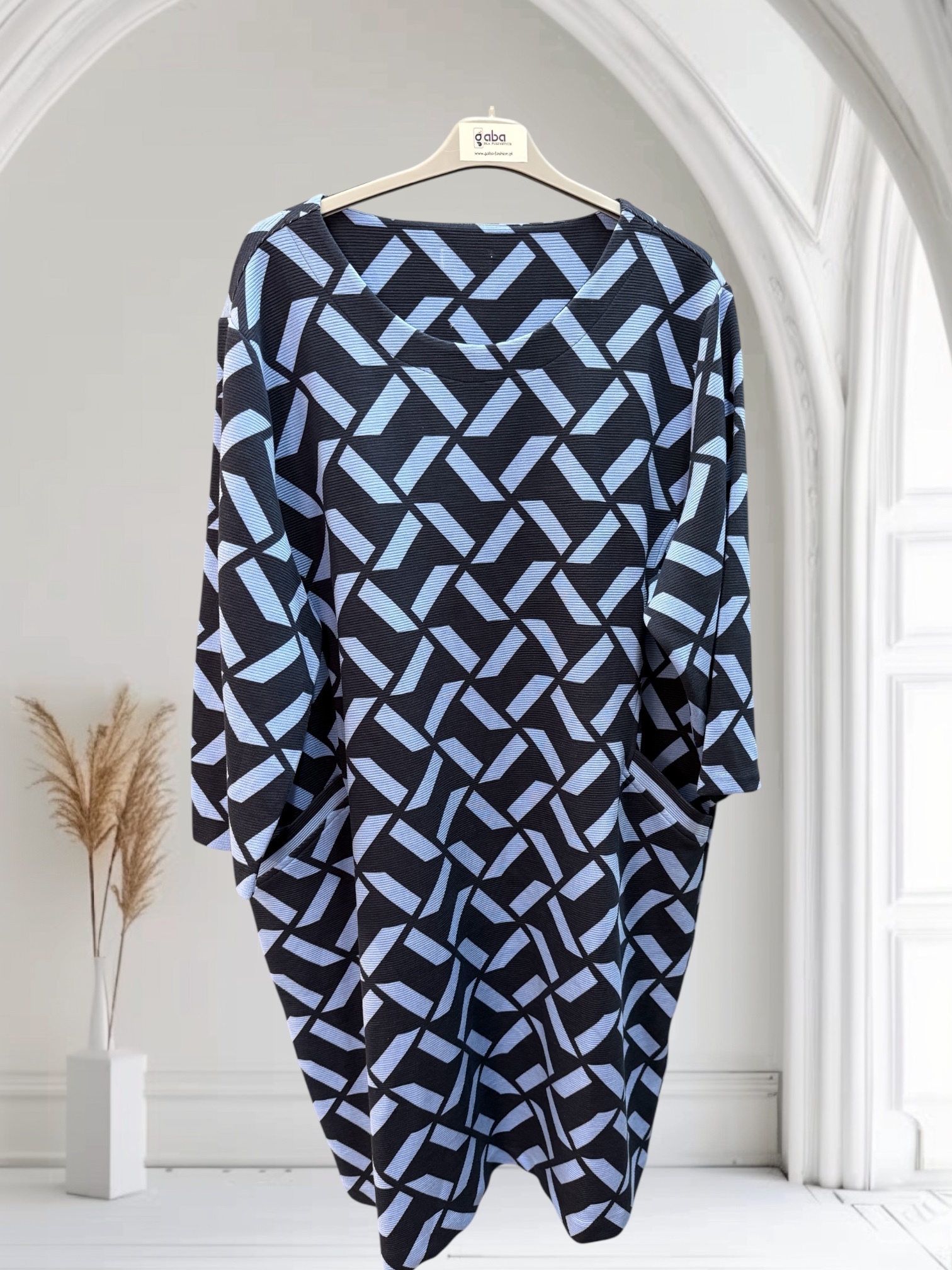 Stylowa sukienka damska o luźnym, oversize’owym kroju, który zapewnia komfort i swobodę ruchów. Model wyróżnia się nowoczesnym geometrycznym wzorem w odcieniach czerni i błękitu, nadającym całości modnego, dynamicznego charakteru.