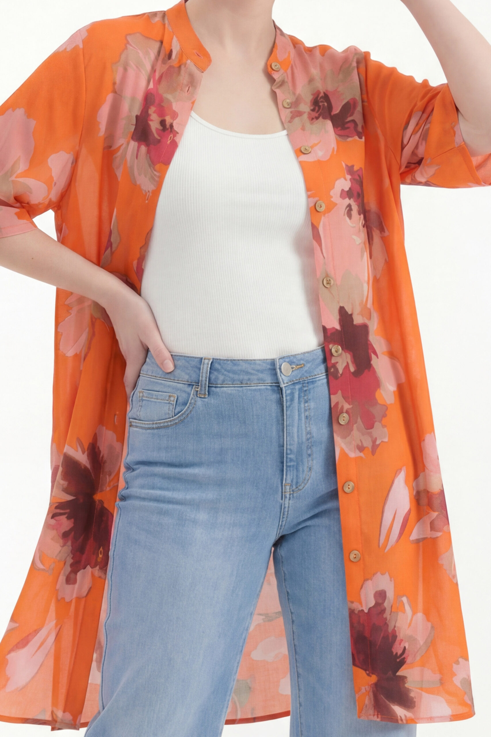 Stylowa tunika marki JMP to idealna propozycja na ciepłe dni dla kobiet plus size, które cenią wygodę i wyrazisty styl. Model w intensywnym, pomarańczowym kolorze ozdobiony dużym, kwiatowym printem przyciąga uwagę i nadaje stylizacji letniego, świeżego charakteru.