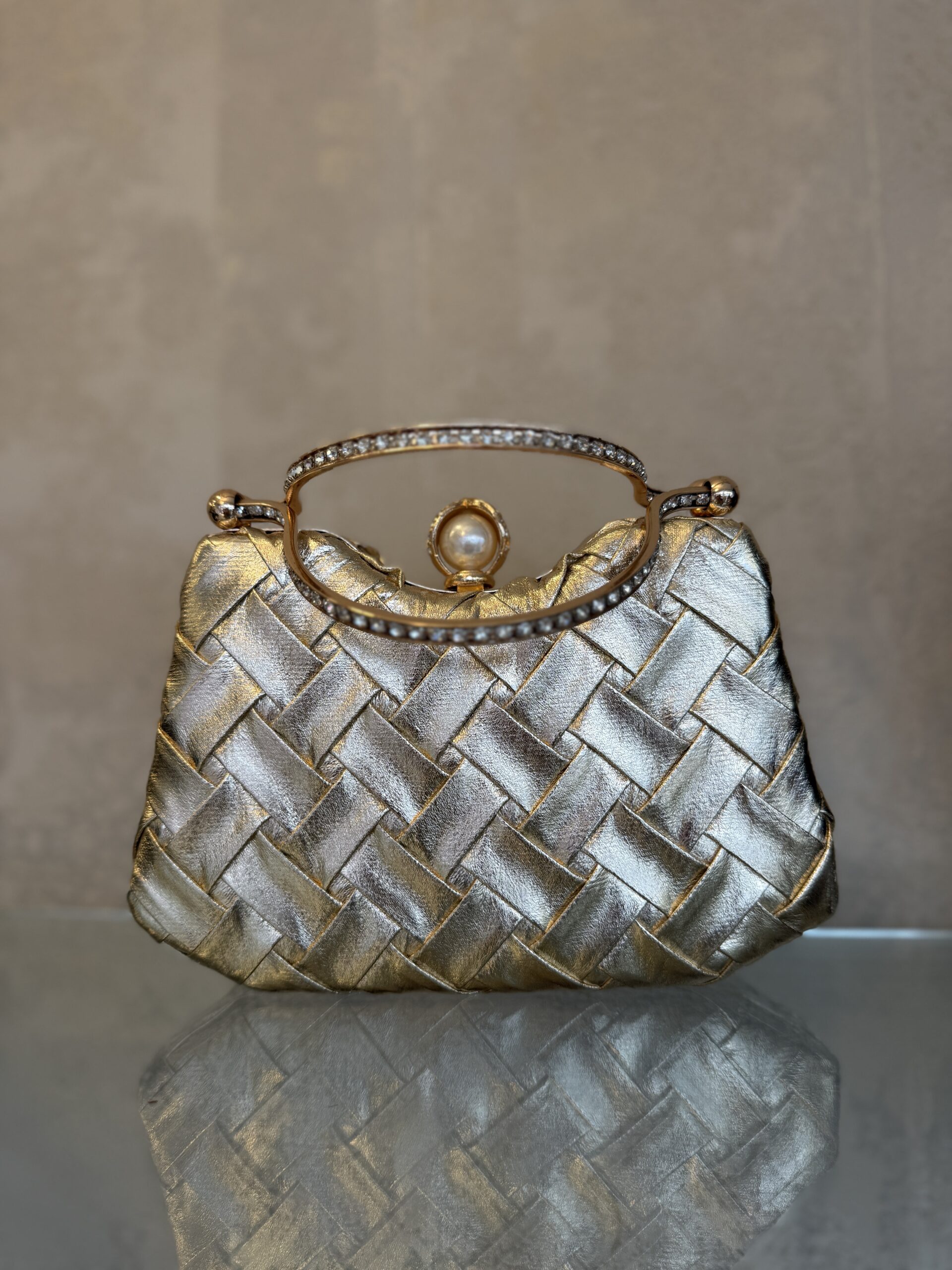 Złota torebka wieczorowa z plecionką i biżuteryjną rączkąZłota torebka wieczorowa z plecionką i biżuteryjną rączką